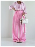 Calça feminino elegante é perfeito para ocasiões casuais e formais. Calça de cintura alta, ambas em um tom delicado de rosa pastel. Feito com tecido confortável e de alta qualidade, este conjunto proporciona movimento e estilo para o dia a dia.